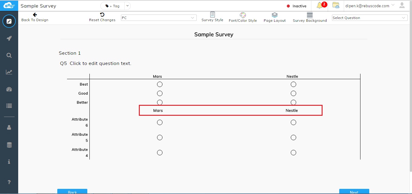 By default, when a Rank question is added, there will be only one attribute added by default. Clicking on '+' sign will add the number of attributes of a question. Clicking on '-' sign will delete the attributes.