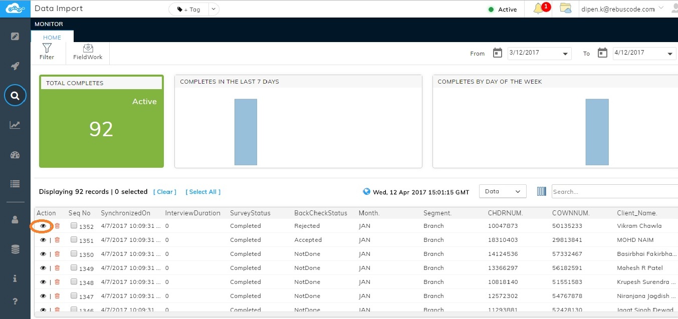 Once data is collected, the list of respondents show up in the Monitor grid. Users can review each respondent in the grid. To review the data, click on the Review icon for the row/respondent you want to review.