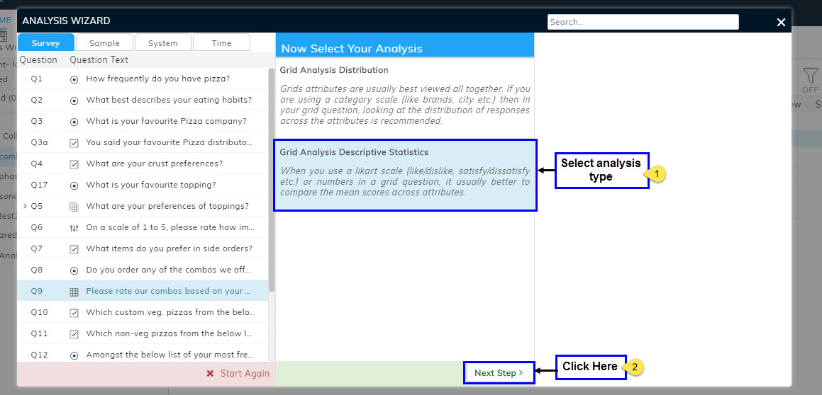 To create your Grid Analysis Descriptive Statistics analysis, in the Analysis wizard select grid type question and click on Next.