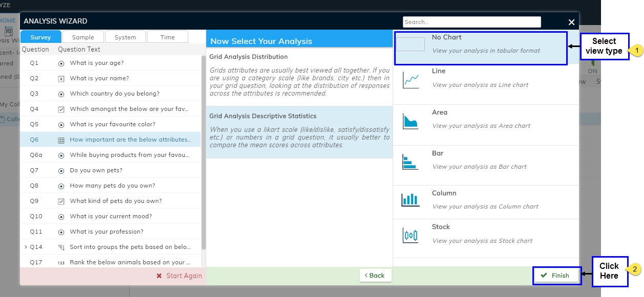 You will be directed to different viewing options based on your selected Analysis type. Select view as grid (No Chart) or any other chart type and click on Finish.