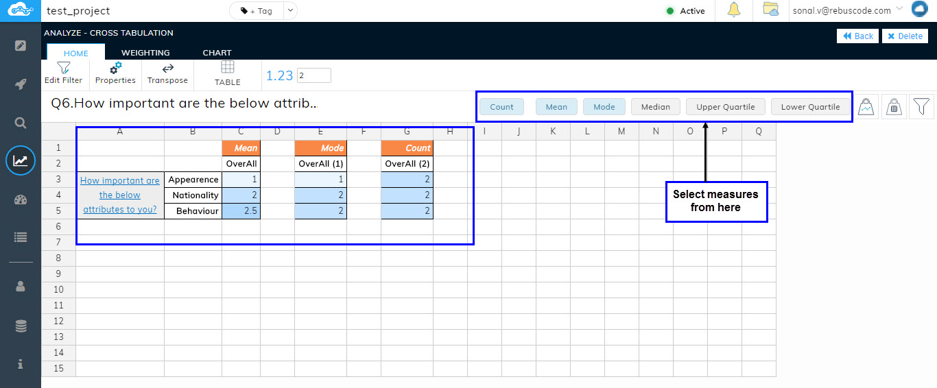 Your analysis will be created and will look as below. The available measures for this analysis are Count, Mean, Median, Mode, Upper and Lower Quartile.